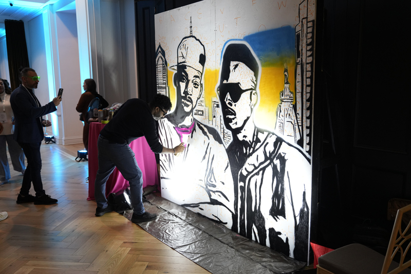 Philadelphia artist, Alloyius Mcilwaine, captivated guests with a live painting session during the event. Known for blending graffiti and abstract art, he created a Fresh Prince–themed mural on site, inviting attendees into an interactive celebration of Philly art and style.
