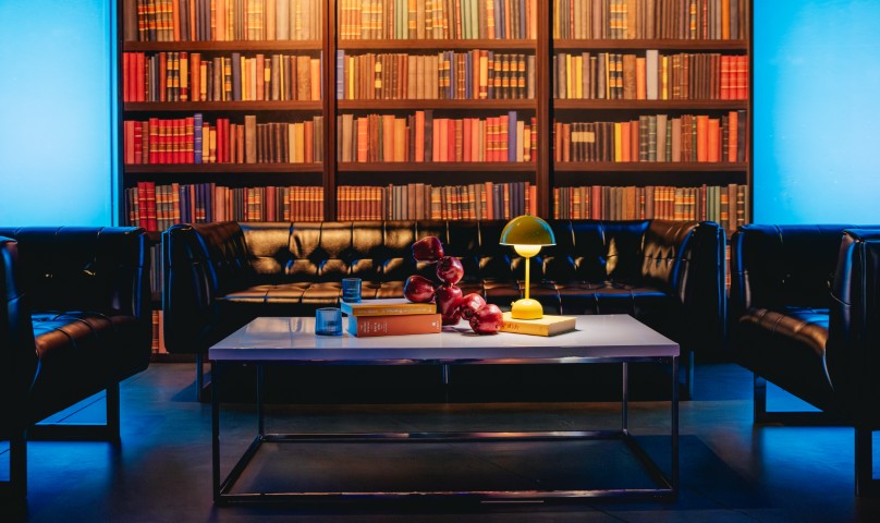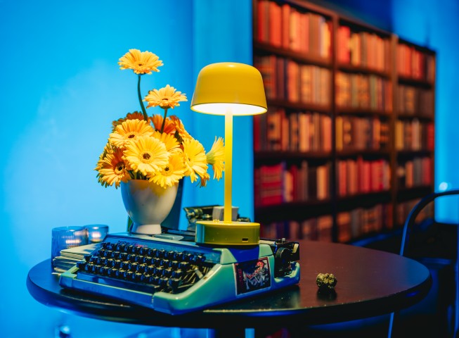 “The Library” featured a sculptural bookshelf backdrop including leather seating and centerpieces of table lamps, novels, and apples, creating a refined, studious setting for conversation. A typist with a vintage typewriter crafted personalized haikus and poetry, providing an interactive touch that delighted attendees.